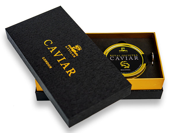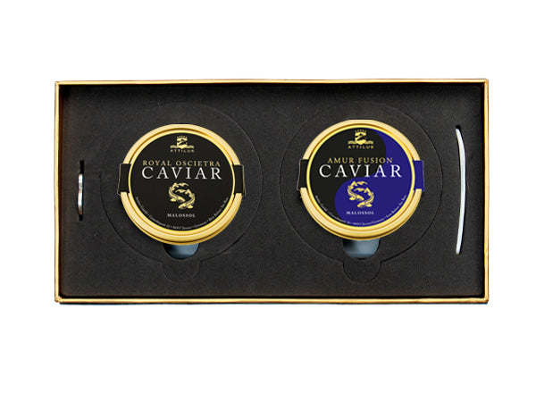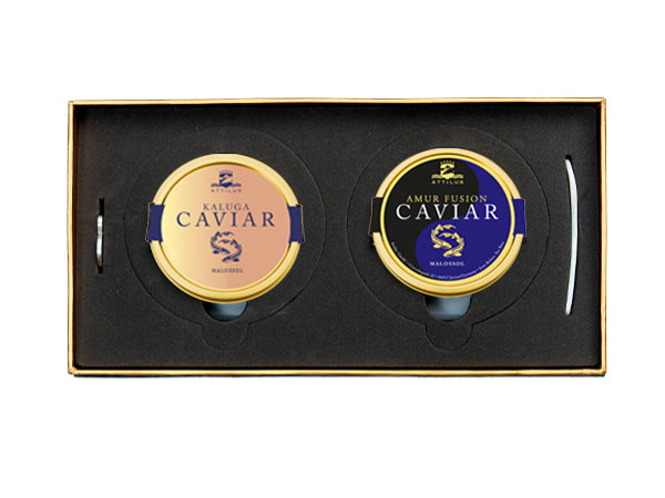 This caviar set is presented in an elegant, specifically designed exclusive Attilus Gift Box with two tins of caviar from our selection, as well as a Mother-of-pearl spoon and a caviar tin opener. The sets are available for 50 and 125g tins.